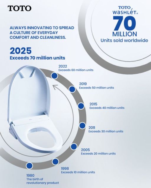 TOTO Ltd., headquartered in Japan has announced that worldwide shipments of its WASHLET product line have surpassed 70 million units. A major achievement that follows more than four decades of continuous innovation across residential and public restroom applications in Japan and international markets. Available in more than 100 countries, demand has increased significantly in the Americas, Europe, and Asia Markets. Spotlighting the rapid rise in adoption toward higher standards of hygiene, comfort, and wellness.